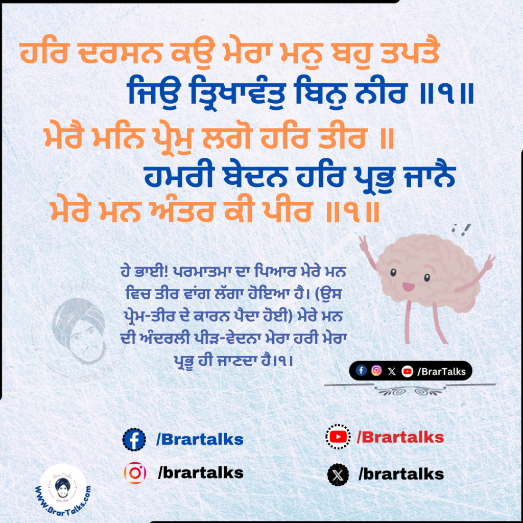 ਅਰਥ: ਹੇ ਭਾਈ! ਪਰਮਾਤਮਾ ਦਾ ਪਿਆਰ ਮੇਰੇ ਮਨ ਵਿਚ ਤੀਰ ਵਾਂਗ ਲੱਗਾ ਹੋਇਆ ਹੈ। (ਉਸ ਪ੍ਰੇਮ-ਤੀਰ ਦੇ ਕਾਰਨ ਪੈਦਾ ਹੋਈ) ਮੇਰੇ ਮਨ ਦੀ ਅੰਦਰਲੀ ਪੀੜ-ਵੇਦਨਾ ਮੇਰਾ ਹਰੀ ਮੇਰਾ ਪ੍ਰਭੂ ਹੀ ਜਾਣਦਾ ਹੈ।੧।ਰਹਾਉ।