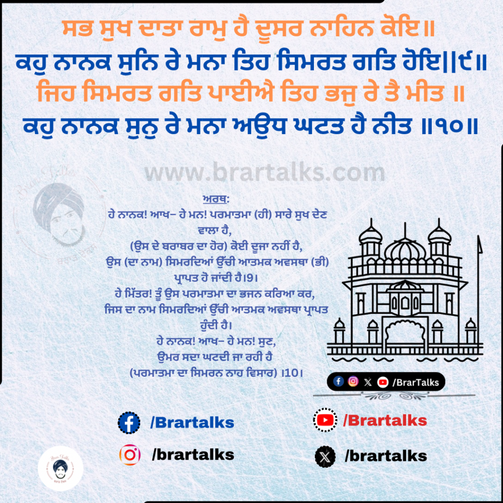 ਸਭ ਸੁਖ ਦਾਤਾ ਰਾਮੁ ਹੈ ਦੂਸਰ ਨਾਹਿਨ ਕੋਇ ॥ ਕਹੁ ਨਾਨਕ ਸੁਨਿ ਰੇ ਮਨਾ ਤਿਹ ਸਿਮਰਤ ਗਤਿ ਹੋਇ ॥੯॥ ਜਿਹ ਸਿਮਰਤ ਗਤਿ ਪਾਈਐ ਤਿਹ ਭਜੁ ਰੇ ਤੈ ਮੀਤ ॥ ਕਹੁ ਨਾਨਕ ਸੁਨੁ ਰੇ ਮਨਾ ਅਉਧ ਘਟਤ ਹੈ ਨੀਤ ॥੧੦॥ {ਪੰਨਾ 1426-1427}