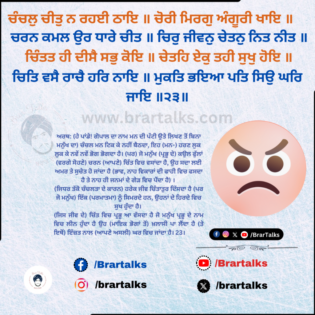 ਚੰਚਲੁ ਚੀਤੁ ਨ ਰਹਈ ਠਾਇ ॥ ਚੋਰੀ ਮਿਰਗੁ ਅੰਗੂਰੀ ਖਾਇ ॥ ਚਰਨ ਕਮਲ ਉਰ ਧਾਰੇ ਚੀਤ ॥ ਚਿਰੁ ਜੀਵਨੁ ਚੇਤਨੁ ਨਿਤ ਨੀਤ ॥ ਚਿੰਤਤ ਹੀ ਦੀਸੈ ਸਭੁ ਕੋਇ ॥ ਚੇਤਹਿ ਏਕੁ ਤਹੀ ਸੁਖੁ ਹੋਇ ॥ ਚਿਤਿ ਵਸੈ ਰਾਚੈ ਹਰਿ ਨਾਇ ॥ ਮੁਕਤਿ ਭਇਆ ਪਤਿ ਸਿਉ ਘਰਿ ਜਾਇ ॥੨੩॥ {ਪੰਨਾ 932}