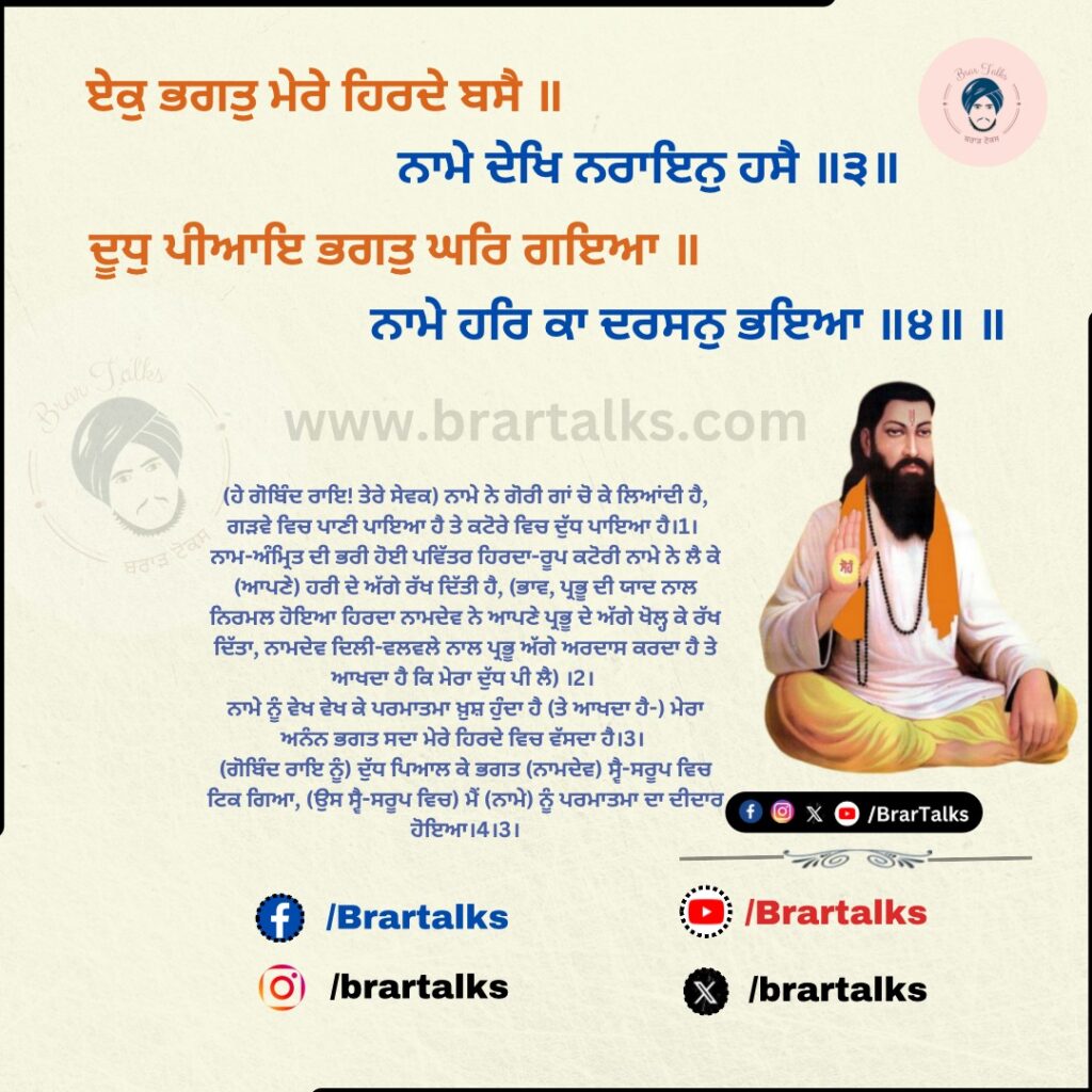 ਏਕੁ ਭਗਤੁ ਮੇਰੇ ਹਿਰਦੇ ਬਸੈ ॥ ਨਾਮੇ ਦੇਖਿ ਨਰਾਇਨੁ ਹਸੈ ॥੩॥ ਦੂਧੁ ਪੀਆਇ ਭਗਤੁ ਘਰਿ ਗਇਆ ॥ ਨਾਮੇ ਹਰਿ ਕਾ ਦਰਸਨੁ ਭਇਆ ॥੪॥