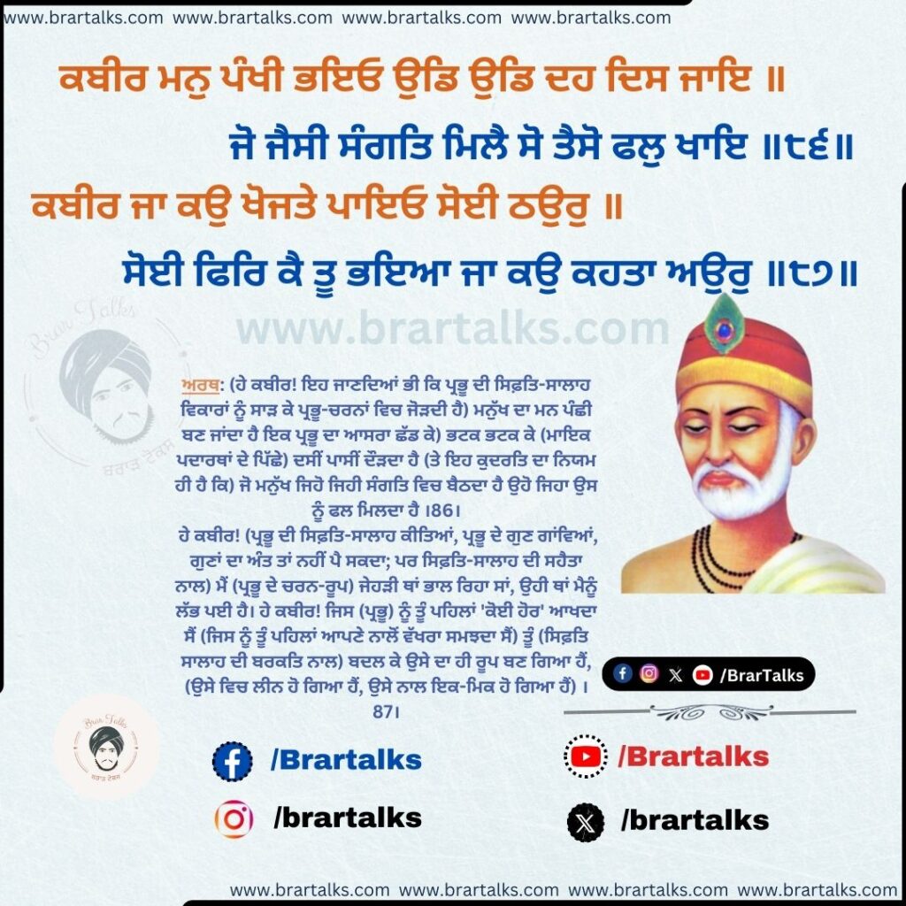 ਕਬੀਰ ਮਨੁ ਪੰਖੀ ਭਇਓ ਉਡਿ ਉਡਿ ਦਹ ਦਿਸ ਜਾਇ ॥ ਜੋ ਜੈਸੀ ਸੰਗਤਿ ਮਿਲੈ ਸੋ ਤੈਸੋ ਫਲੁ ਖਾਇ ॥੮੬॥ ਕਬੀਰ ਜਾ ਕਉ ਖੋਜਤੇ ਪਾਇਓ ਸੋਈ ਠਉਰੁ ॥ ਸੋਈ ਫਿਰਿ ਕੈ ਤੂ ਭਇਆ ਜਾ ਕਉ ਕਹਤਾ ਅਉਰੁ ॥੮੭॥