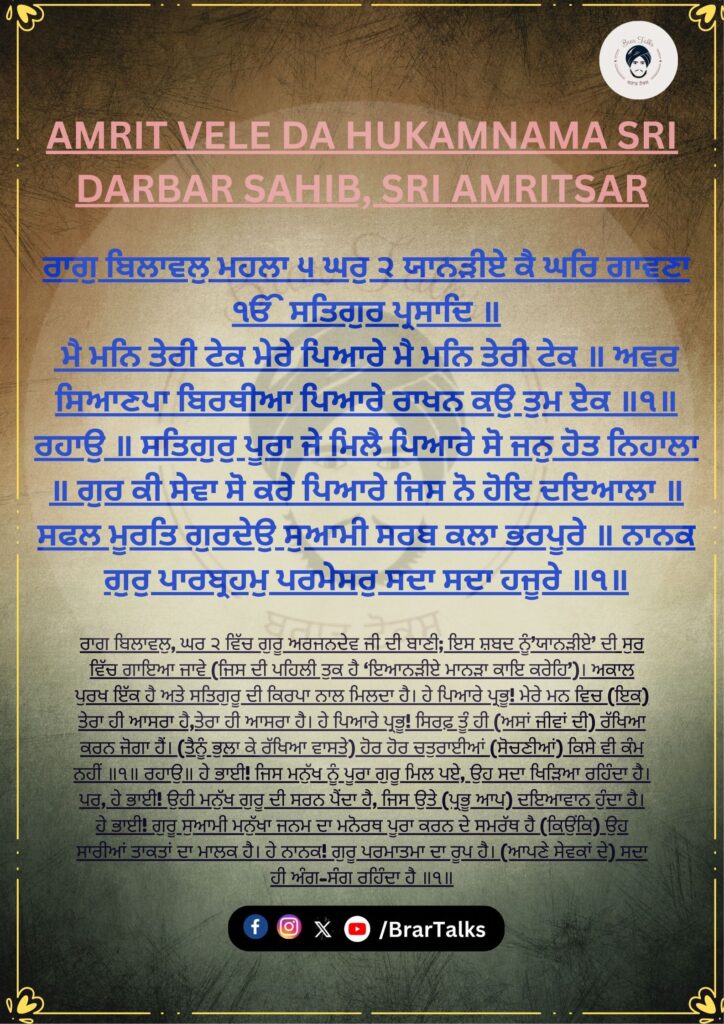 ਰਾਗੁ ਬਿਲਾਵਲੁ ਮਹਲਾ ੫ ਘਰੁ ੨ ਯਾਨੜੀਏ ਕੈ ਘਰਿ ਗਾਵਣਾ ੴ ਸਤਿਗੁਰ ਪ੍ਰਸਾਦਿ ॥ ਮੈ ਮਨਿ ਤੇਰੀ ਟੇਕ ਮੇਰੇ ਪਿਆਰੇ ਮੈ ਮਨਿ ਤੇਰੀ ਟੇਕ ॥ ਅਵਰ ਸਿਆਣਪਾ ਬਿਰਥੀਆ ਪਿਆਰੇ ਰਾਖਨ ਕਉ ਤੁਮ ਏਕ ॥੧॥ ਰਹਾਉ ॥ ਸਤਿਗੁਰੁ ਪੂਰਾ ਜੇ ਮਿਲੈ ਪਿਆਰੇ ਸੋ ਜਨੁ ਹੋਤ ਨਿਹਾਲਾ ॥ ਗੁਰ ਕੀ ਸੇਵਾ ਸੋ ਕਰੇ ਪਿਆਰੇ ਜਿਸ ਨੋ ਹੋਇ ਦਇਆਲਾ ॥ ਸਫਲ ਮੂਰਤਿ ਗੁਰਦੇਉ ਸੁਆਮੀ ਸਰਬ ਕਲਾ ਭਰਪੂਰੇ ॥ ਨਾਨਕ ਗੁਰੁ ਪਾਰਬ੍ਰਹਮੁ ਪਰਮੇਸਰੁ ਸਦਾ ਸਦਾ ਹਜੂਰੇ ॥੧॥
