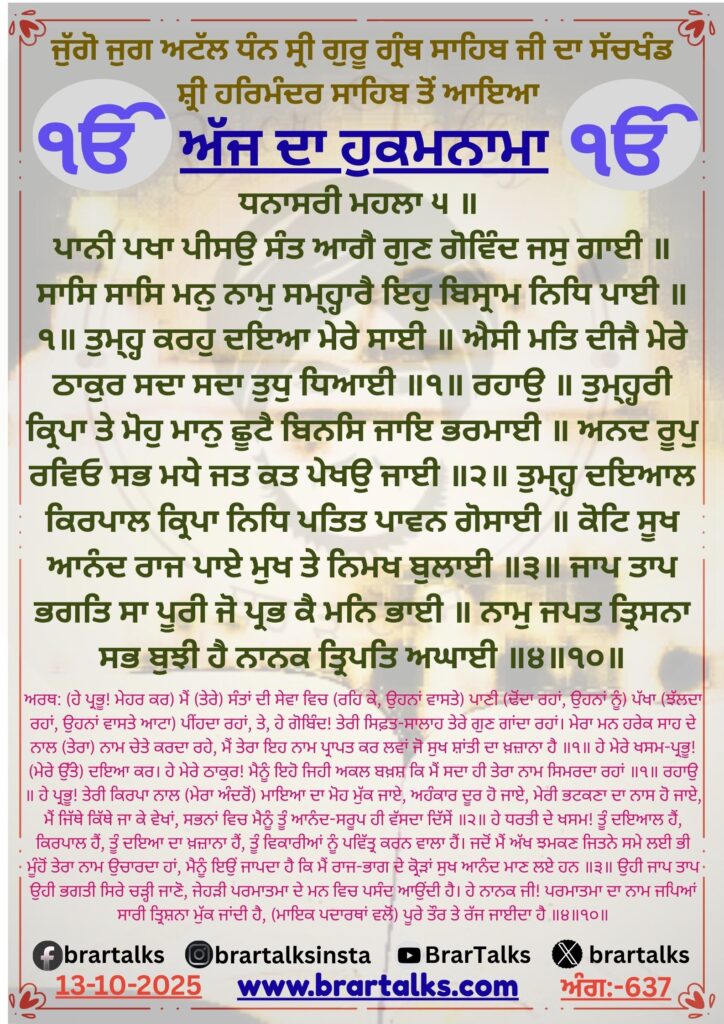 13 OCTOBER  2025| HUKAMNAMA | SACHKHAND SHRI HARMANDER SAHIB JI,Amritsar