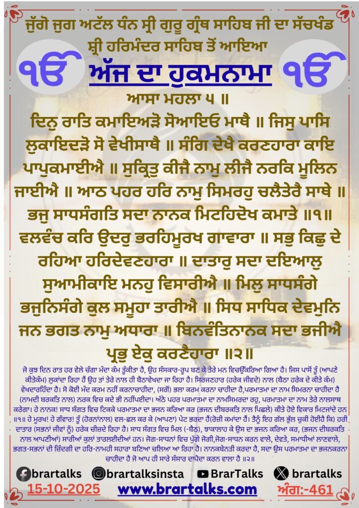 15 OCTOBER  2025| HUKAMNAMA | SACHKHAND SHRI HARMANDER SAHIB JI,Amritsar