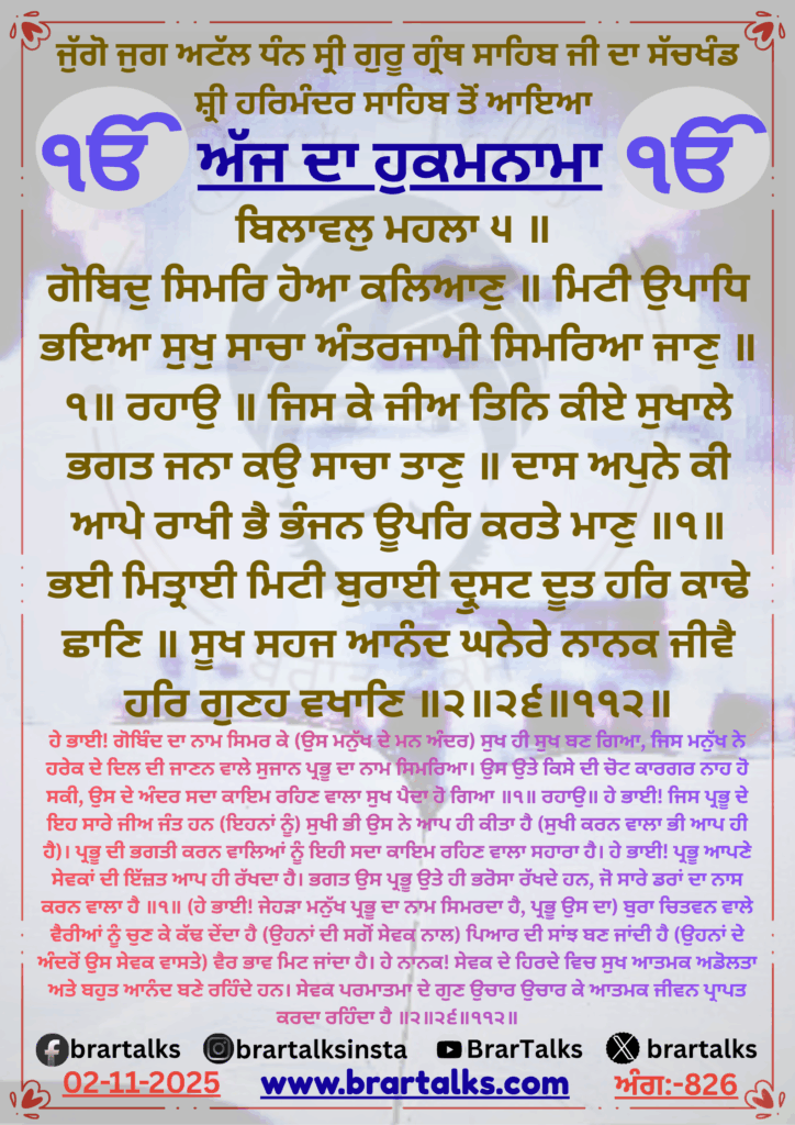 ਬਿਲਾਵਲੁ ਮਹਲਾ ੫ ॥ ਗੋਬਿਦੁ ਸਿਮਰਿ ਹੋਆ ਕਲਿਆਣੁ ॥ ਮਿਟੀ ਉਪਾਧਿ ਭਇਆ ਸੁਖੁ ਸਾਚਾ ਅੰਤਰਜਾਮੀ ਸਿਮਰਿਆ ਜਾਣੁ ॥੧॥ ਰਹਾਉ ॥ ਜਿਸ ਕੇ ਜੀਅ ਤਿਨਿ ਕੀਏ ਸੁਖਾਲੇ ਭਗਤ ਜਨਾ ਕਉ ਸਾਚਾ ਤਾਣੁ ॥ ਦਾਸ ਅਪੁਨੇ ਕੀ ਆਪੇ ਰਾਖੀ ਭੈ ਭੰਜਨ ਊਪਰਿ ਕਰਤੇ ਮਾਣੁ ॥੧॥ ਭਈ ਮਿਤ੍ਰਾਈ ਮਿਟੀ ਬੁਰਾਈ ਦ੍ਰੁਸਟ ਦੂਤ ਹਰਿ ਕਾਢੇ ਛਾਣਿ ॥ ਸੂਖ ਸਹਜ ਆਨੰਦ ਘਨੇਰੇ ਨਾਨਕ ਜੀਵੈ ਹਰਿ ਗੁਣਹ ਵਖਾਣਿ ॥੨॥੨੬॥੧੧੨॥