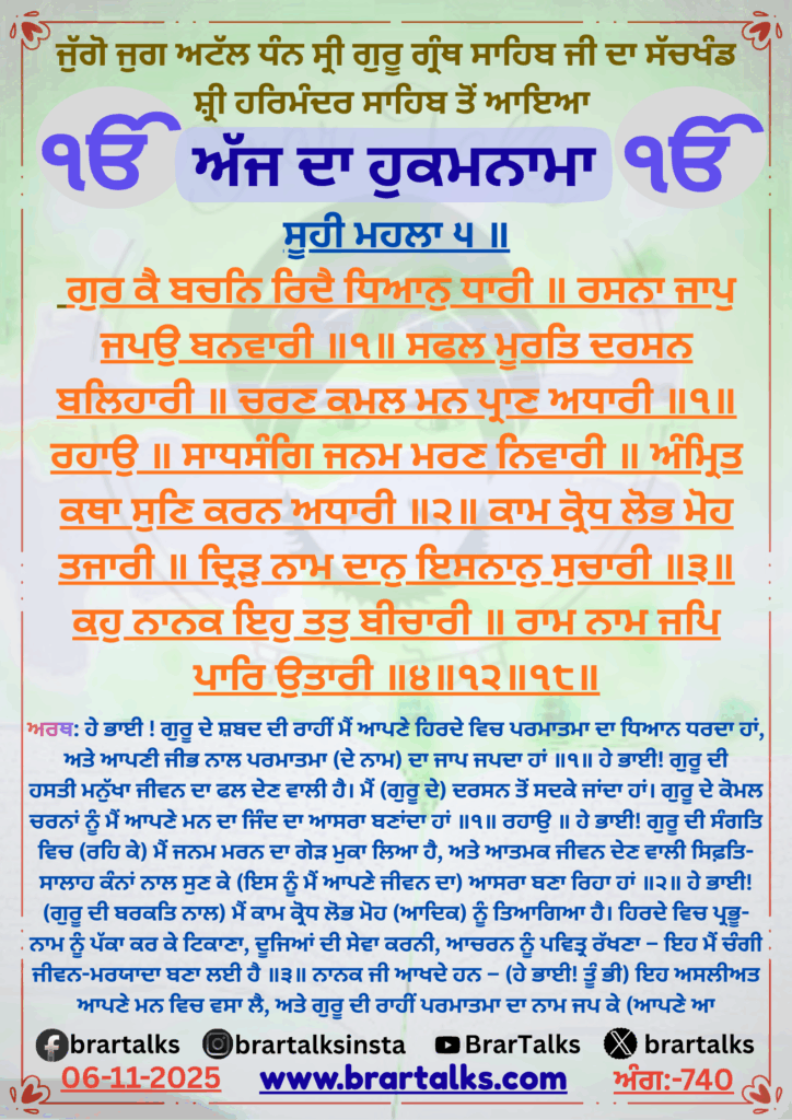 Soohee Mahalaa 5 || Gur Kai Bachan Ridai Dhhiaan Dhhaaree || Rasnaa Jaap Japau Banvaaree ||1|| Safal Moorat Darsan Balehaaree || Charan Kamal Man Praan Adhhaaree ||1|| Rahaau || Saadhhsang Janam Maran Nivaaree || Amrit Kathhaa Sun Karan Adhhaaree ||2|| Kaam Krodhh Lobh Moh Tajaaree || Dhrirr Naam Daan Isnaan Suchaaree ||3|| Kahu Naanak Ehu Tat Beechaaree || Raam Naam Jap Paar Outaaree ||4||12||18||