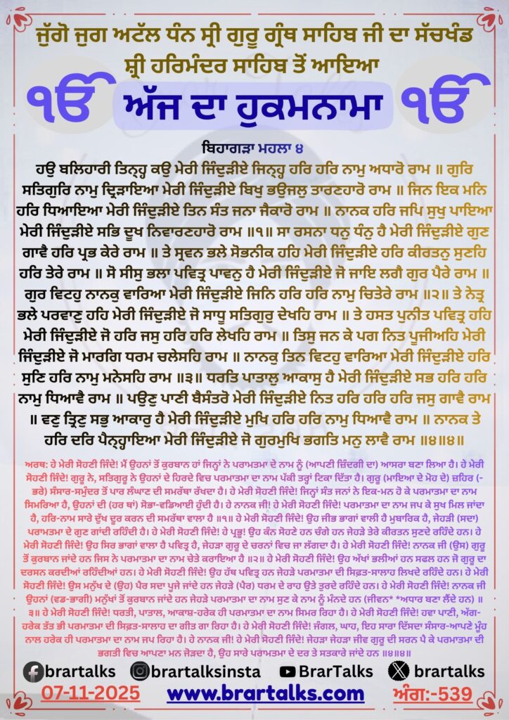 Meaning: I am a sacrifice, O my soul, to those who take the Support of the Name of the Lord, Har, Har. The Guru, the True Guru, implanted the Name within me, O my soul, and He has carried me across the terrifying world-ocean of poison. Those who have meditated one-pointedly on the Lord, O my soul – I proclaim the Victory of those saintly beings. Nanak Ji has found peace, meditating on the Lord, O my soul; the Lord is the Destroyer of all pain. ||1|| Blessed, blessed is that tongue, O my soul, which sings the Glorious Praises of the Lord God. Sublime and splendid are those ears, O my soul, which listen to the Kirtan of the Lord’s Praises. Sublime, pure and pious is that head, O my soul, which falls at the Guru’s Feet. Nanak Ji is a sacrifice to that Guru, O my soul; the Guru has placed the Name of the Lord, Har, Har, in my mind. ||2|| Blessed and approved are those eyes, O my soul, which gaze upon the Holy True Guru. Sacred and sanctified are those hands, O my soul, which write the Praises of the Lord, Har, Har. I worship continually the feet of that humble being, O my soul, who walks on the Path of Dharma – the path of righteousness. Nanak Ji is a sacrifice to those, O my soul, who hear of the Lord, and believe in the Lord’s Name. ||3|| The earth, the nether regions of the underworld, and the Akaashic ethers, O my soul, all meditate on the Name of the Lord, Har, Har. Wind, water and fire, O my soul, continually sing the Praises of the Lord, Har, Har, Har. The woods, the meadows* *and the whole world, O my soul, chant with their mouths the Lord’s Name, and meditate on the Lord. O Nanak Ji, one who, as Gurmukh, focuses his consciousness on the Lord’s devotional worship – O my soul, he is robed in honor in the Court of the Lord. ||4||4||